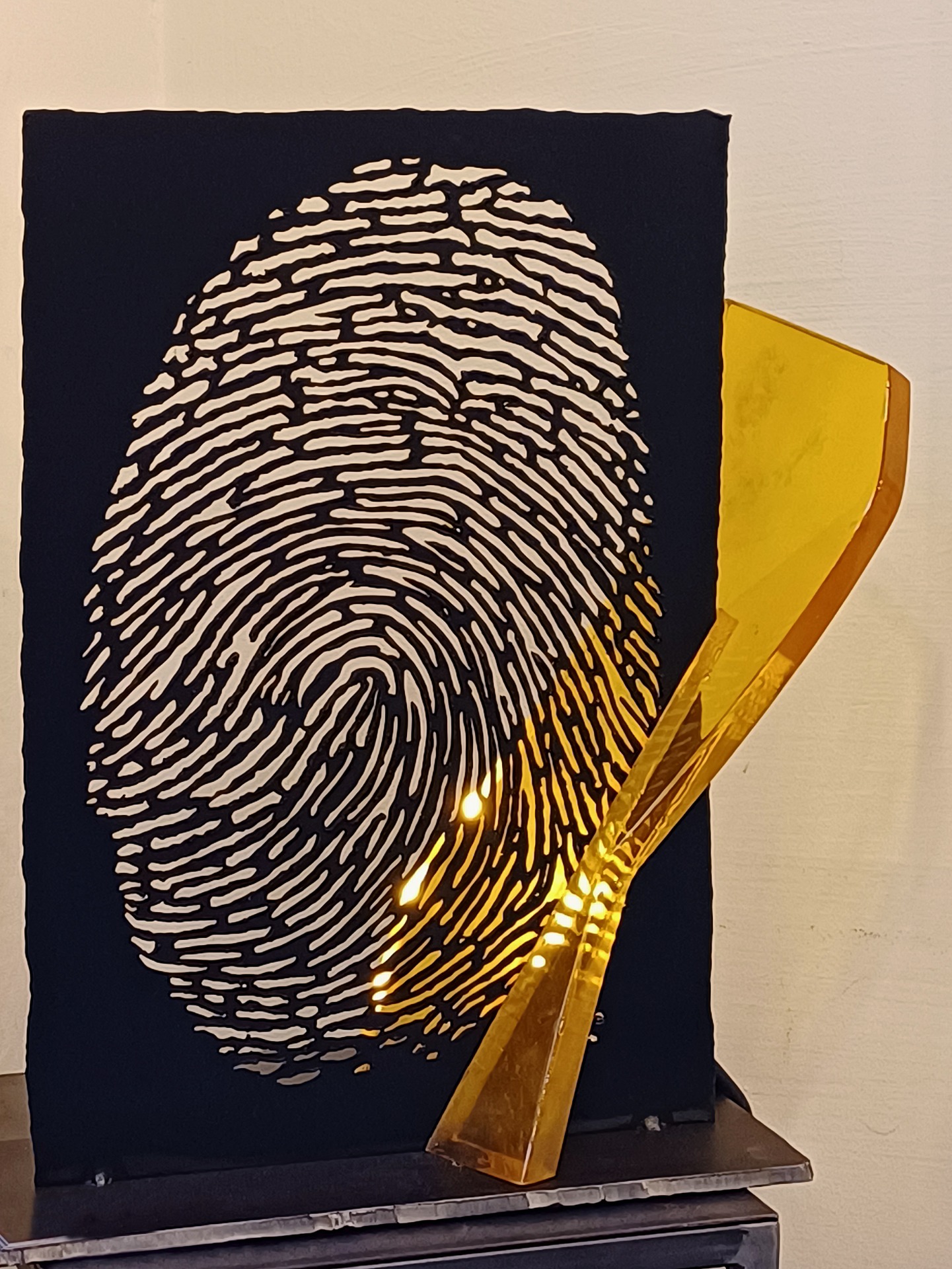 The sculpture is made in metal, the lines in our fingerprint are inlaid with gold leaf just to show how unique and valuable our fingerprint is.